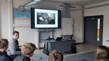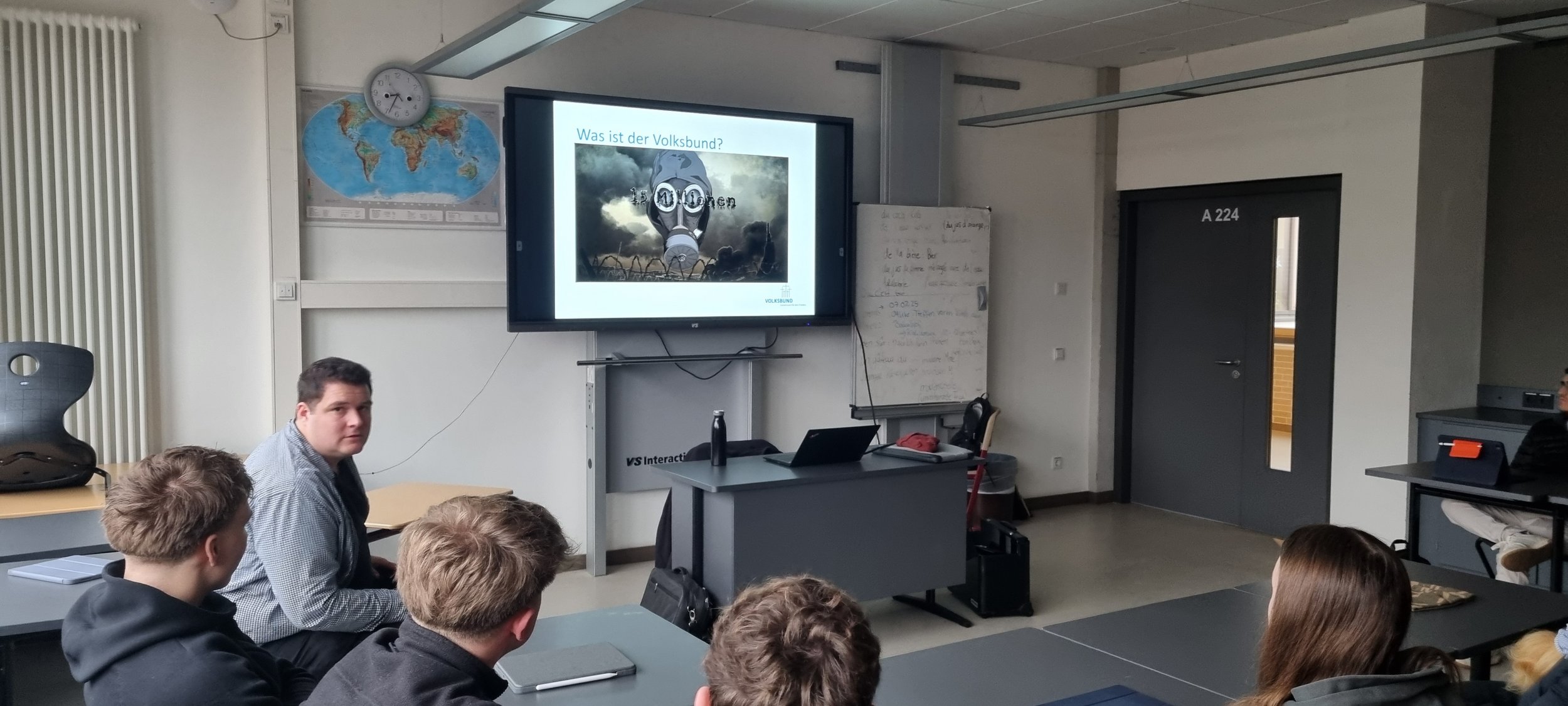 Bei seinem Vortrag in der Schule ging es zunächst um die Friedensarbeit des Volksbundes. Was trägt der Volksbund zur Friedenssicherung und Friedensbildung bei? Dazu informierte er über die Aufgaben des Volksbundes und stellte insbesondere die Bildungsarbeit des Vereins vor.